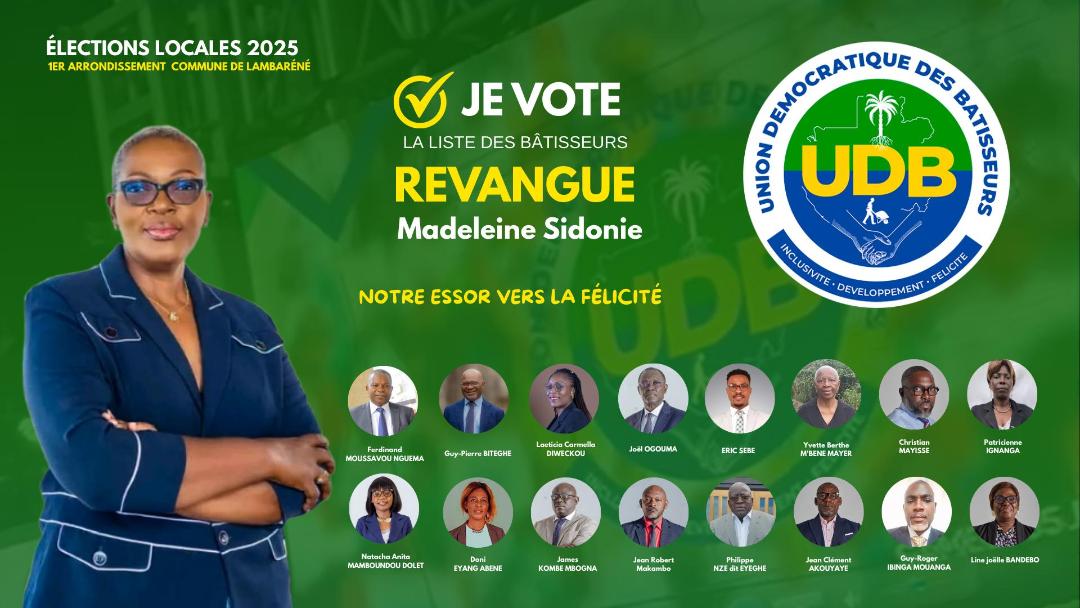 Alors, populations du premier arrondissement de Lambaréné, tous aux urnes le 27 septembre pour donner vos suffrages au parti fondé par Brice Clotaire Oligui Nguema et incarné par Madeleine Sidonie Revangue.